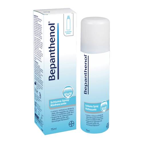 Bepanthenol Schiuma RinfrescanteScottature lievi Descrizione Dispositivo Medico CE. Schiuma soffice, di colore bianco, sotto forma di nano emulsione da applicare su ustioni di lieve entità e scottature solari leggere. Non occorre frizionare per farla penetrare nella pelle, per cui l'applicazione è indolore. Bepanthenol Schiuma Spray è indicato in caso di: - ustioni di lieve entità causate da acqua bollente, vapore, superfici roventi; - scottature solari leggere dovute a una intensa o prolungata esposizione ai raggi solari. Bepanthenol Schiuma Spray dona una sensazione di freschezza e mantiene idratata a lungo la pelle usti...